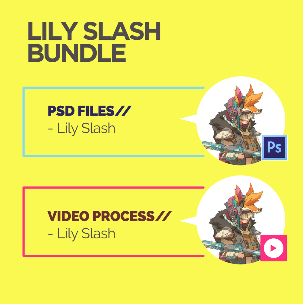 You'll find everything from scratch. How I start composing the anatomy and pose. Once I have it, I start costumizing the body playing with shapes and silhouettes. Then, the coloring process.