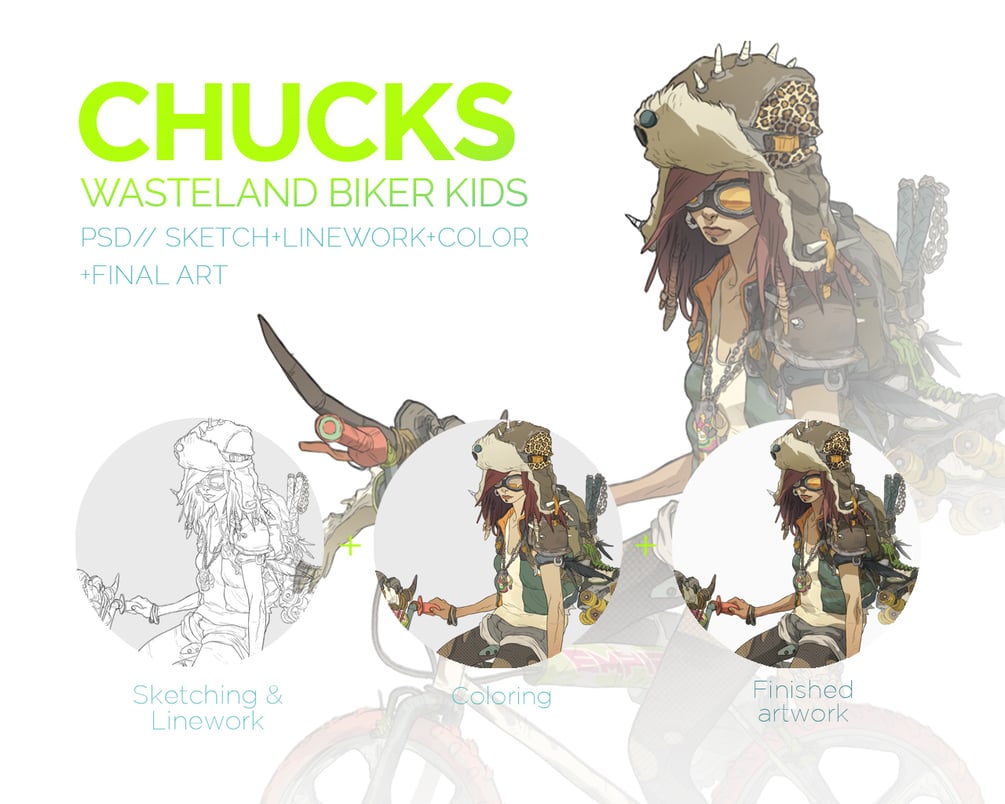 PSD files with underskecthes, tests, lineart, flatt colors, costume versions, color tests and final art. PSD layers